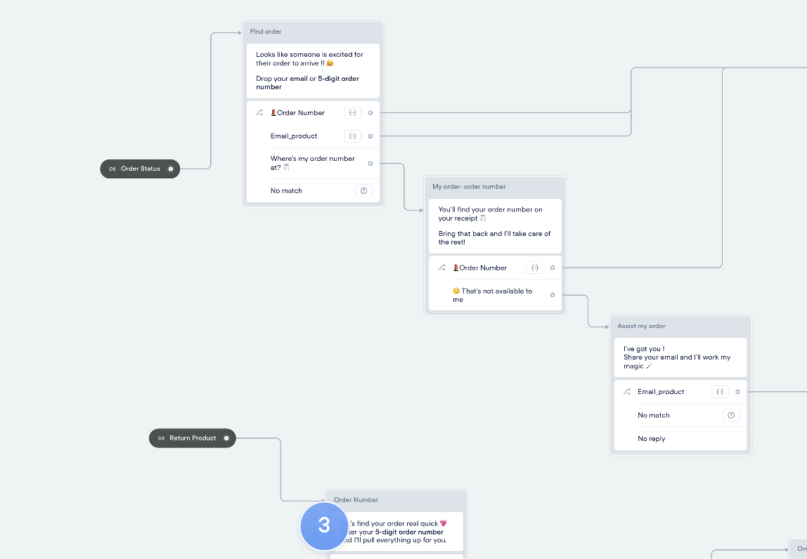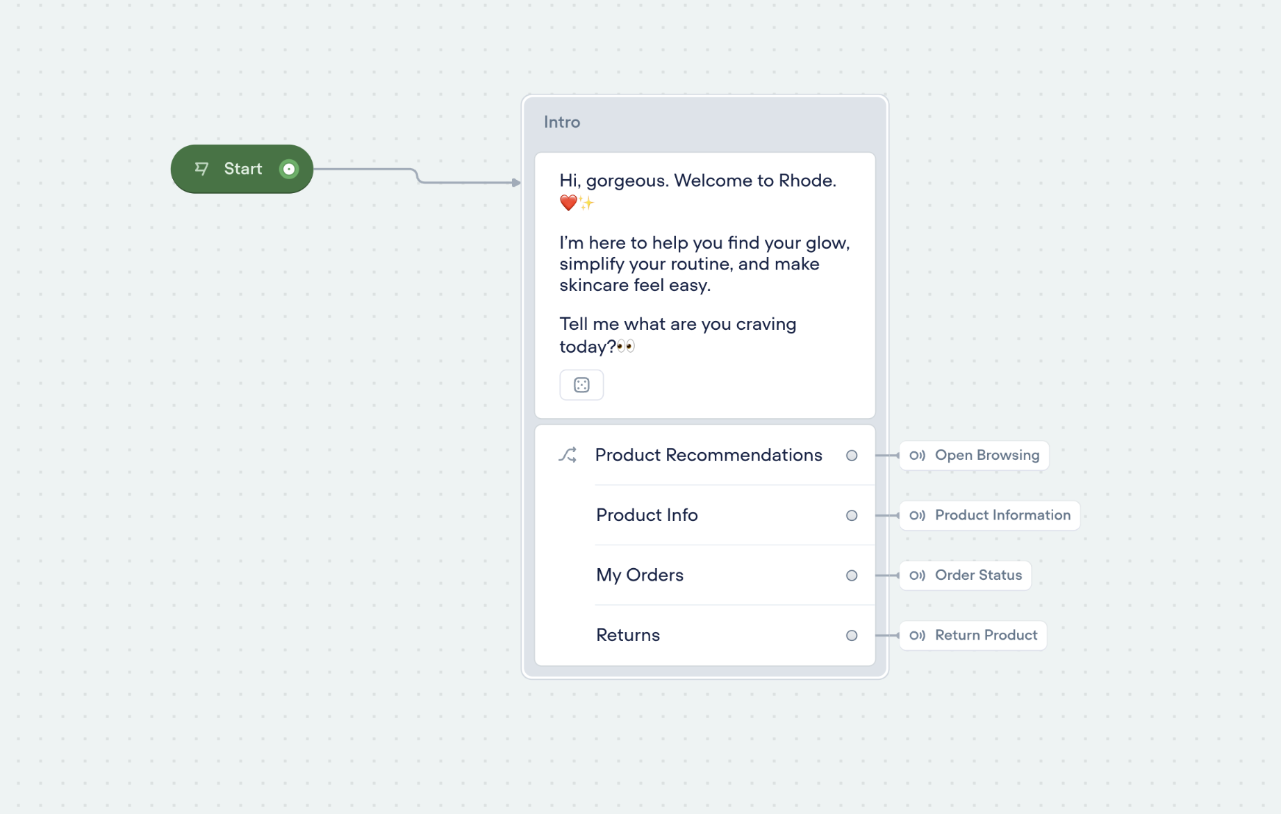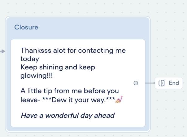 The agent is one main flow with component-based sub-flows for each intent. Every flow connects back into a shared closure block so the ending always feels consistent, no matter how the user got there.