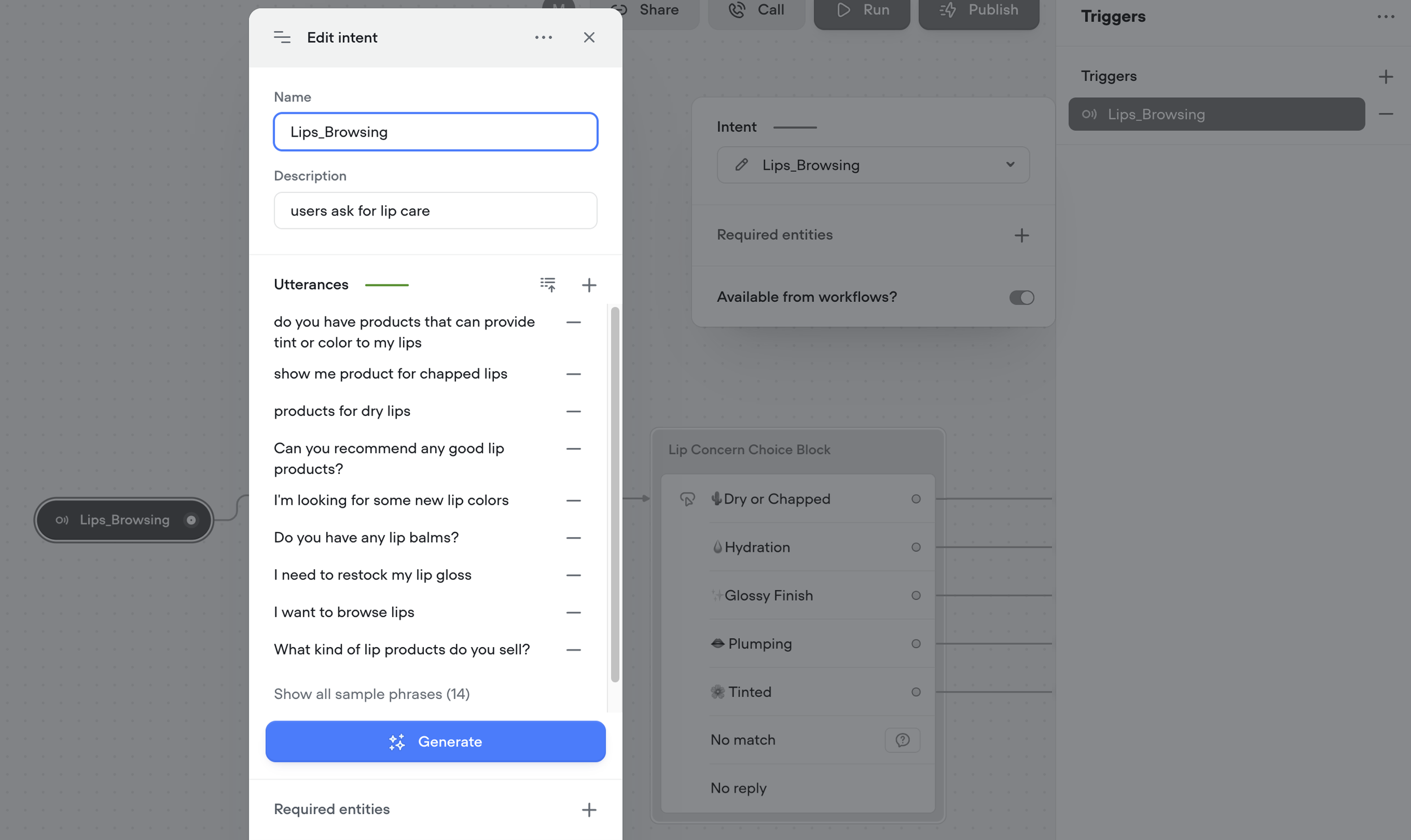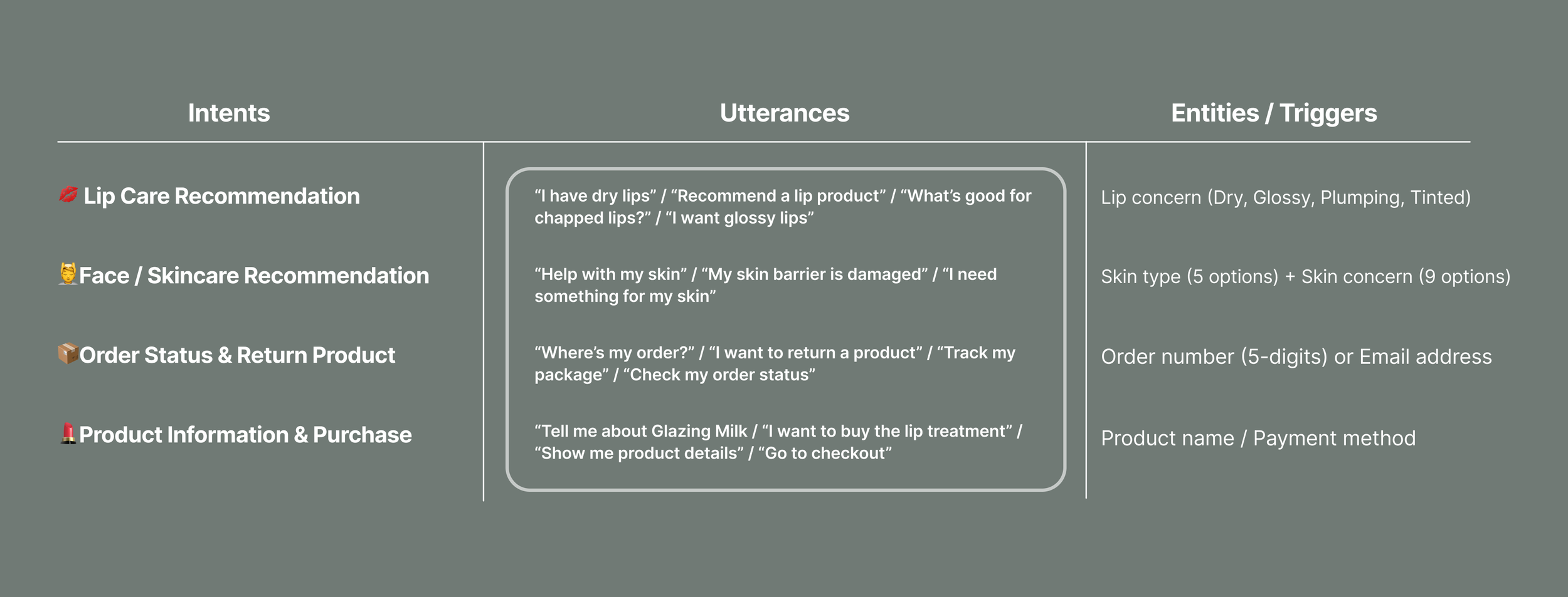 Built 5 key intents and 2 non-intents focused on guiding user interactions, using utterances, entities, and triggers to support natural conversation flows.
