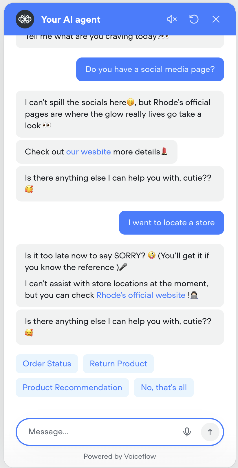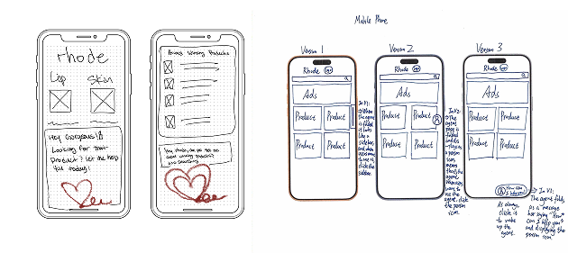 We focused on choosing Rhode — a cosmetic brand launched by Hailey Beiber— because it is a brand that is widely known around the world, but while looking into the website, we found that they did not have a service agent. We first went through the Rhode website to identify a few possible task flows that users could take when interacting with a chat-based service agent.