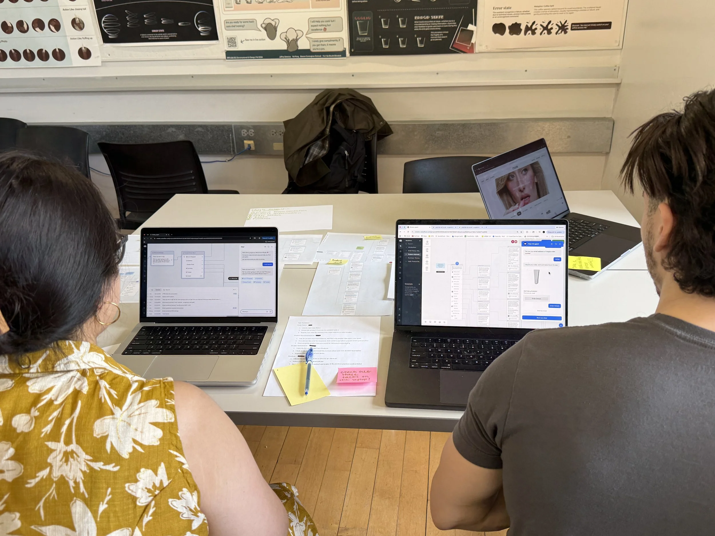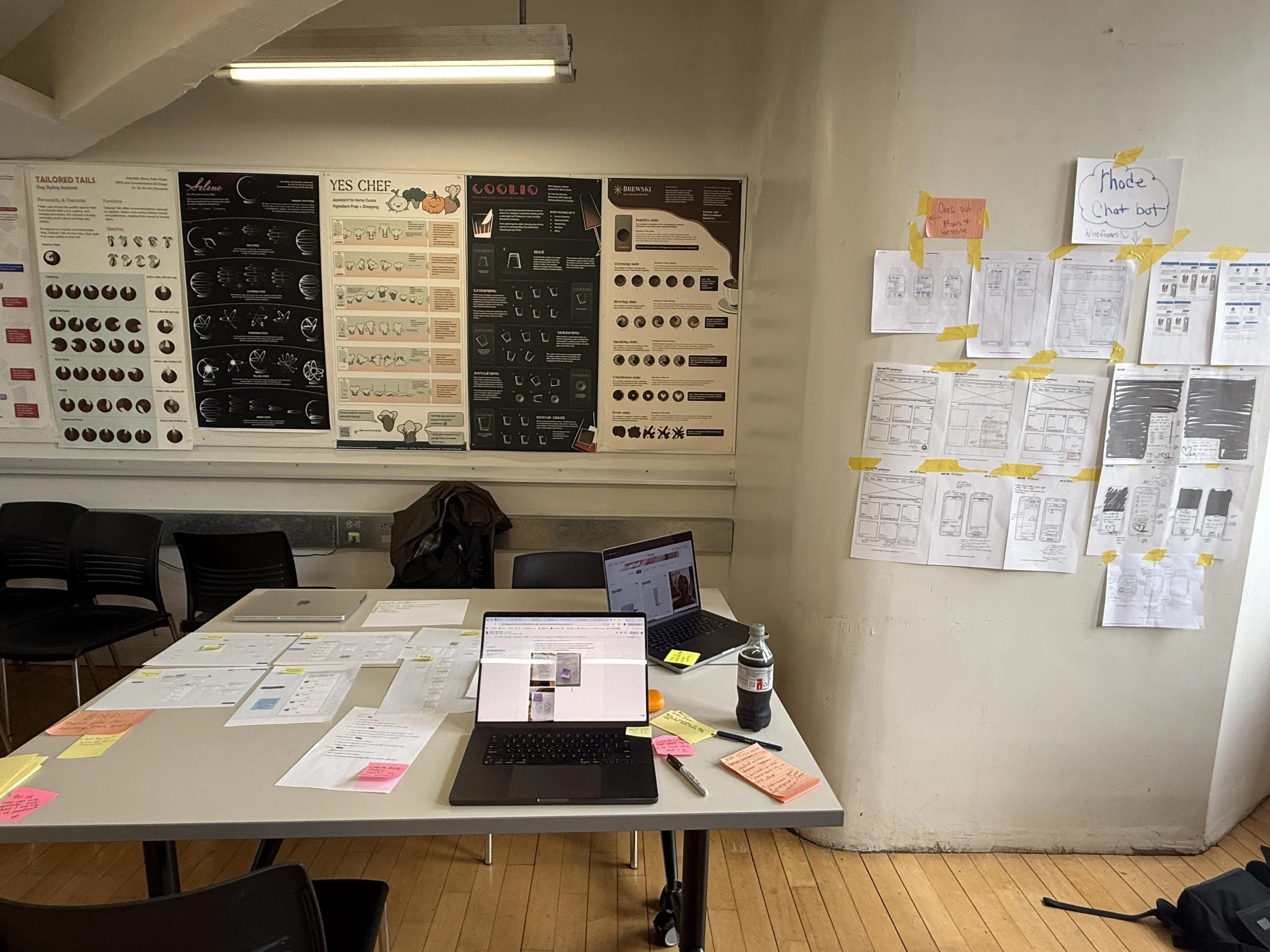 Our setup included printed conversation and task flows, wireframe sketches, task scenarios, and a live Voiceflow prototype displayed on laptops for hands-on testing. We presented key chatbot flows including the: