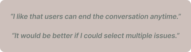Users found the chatbot easy to use and appreciated the ability to navigate or end conversations, but noted some unnatural responses and limited flexibility in selecting multiple concerns, leading to improvements in utterances, intents, and flow design.